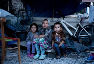 Raihan Mohammadi, five, Farzan Mohammadi, 11, and Ilyas Rezwani, five, in Moria on the Greek island of Lesbos. Photograph: Alice Aedy